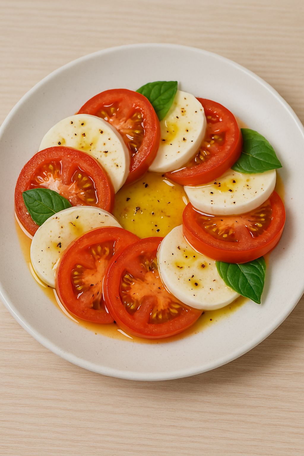 신선한 생모차렐라 치즈, 토마토, 바질잎을 층층이 놓고 올리브오일과 발사믹 식초를 뿌리면 완성되는 이탈리아 스타일 샐러드입니다.
