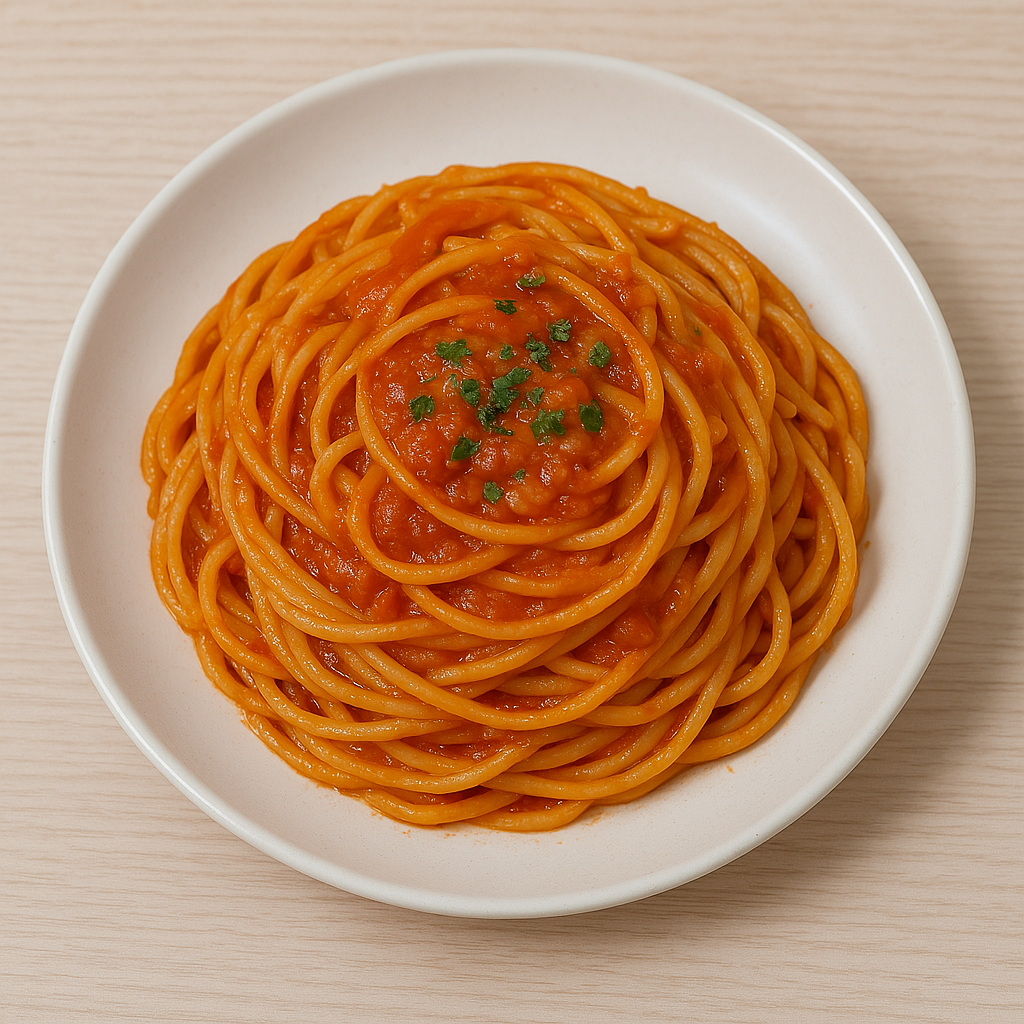 양파, 마늘, 올리브오일과 함께 토마토를 볶아 만든 소스에 면을 넣고 볶아주면 완성!