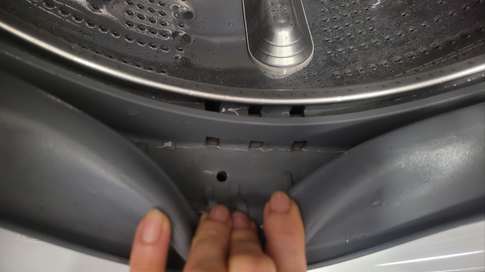 혹시나 해서 세탁기 문을 열어봤더니, 고무패킹에 검은 물때와 곰팡이가 잔뜩 끼어 있는 걸 발견했어요.
