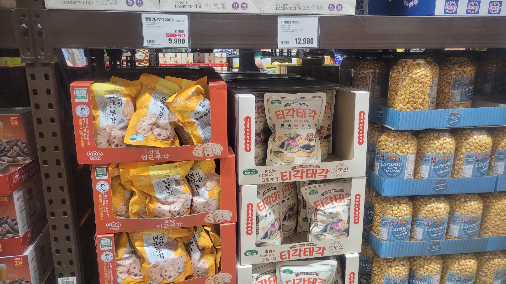 ✔️ 스낵류 코너에서는 찹쌀 연근부각(9,980원), 티각태각, 김부각, 카라멜 팝콘 등 눈에 띄었어요.