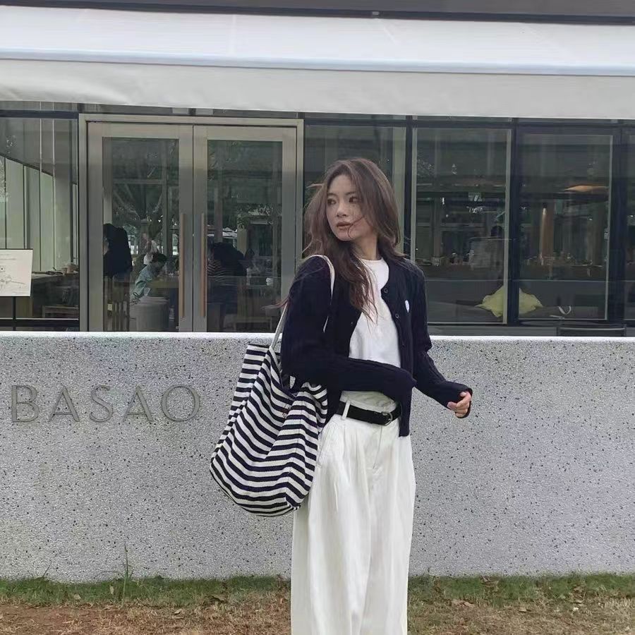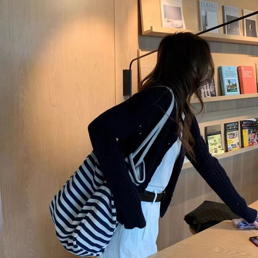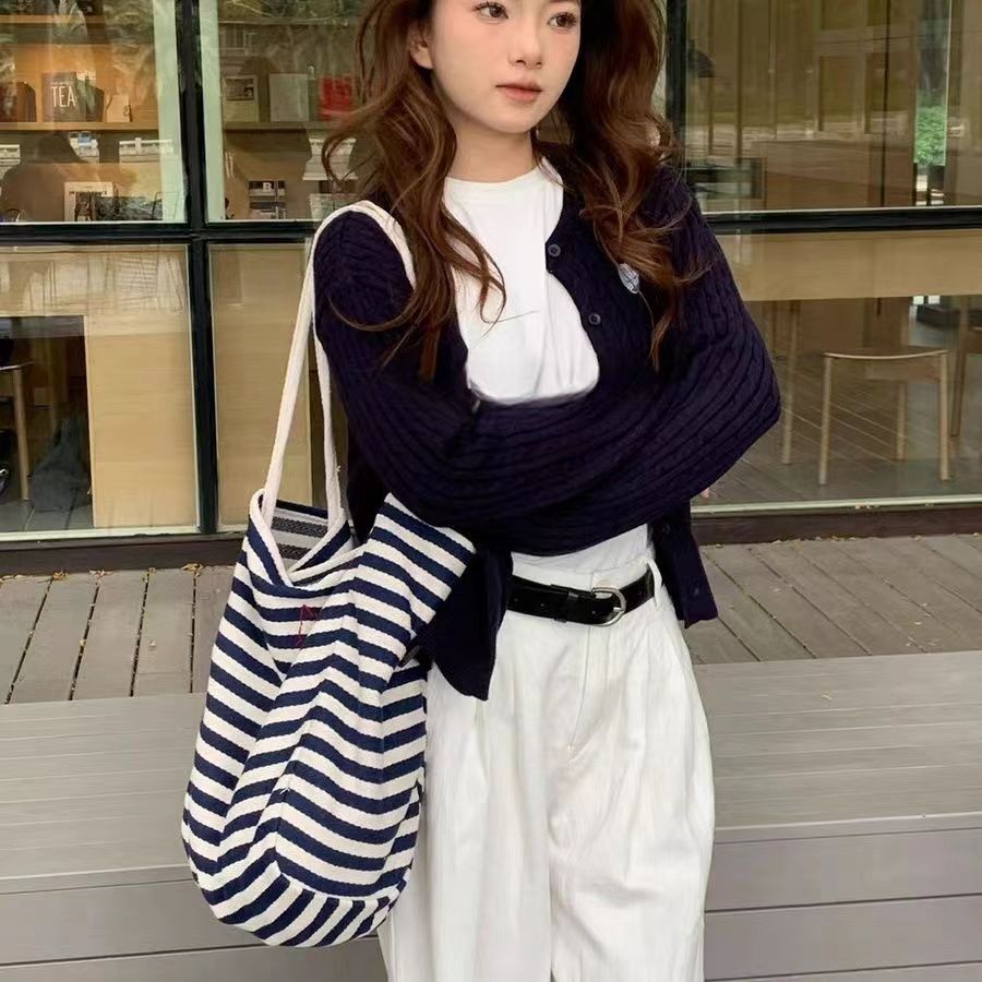 사진 속 스트라이프 에코백은 캔버스 소재라 형태가 쉽게 무너지지 않고, 블랙&화이트 스트라이프 디자인이라 어떤 옷에도 무난하게 잘 어울립니다. 캐주얼한 데일리룩은 물론, 코트나 니트와 매치해도 깔끔한 느낌을 줍니다.
